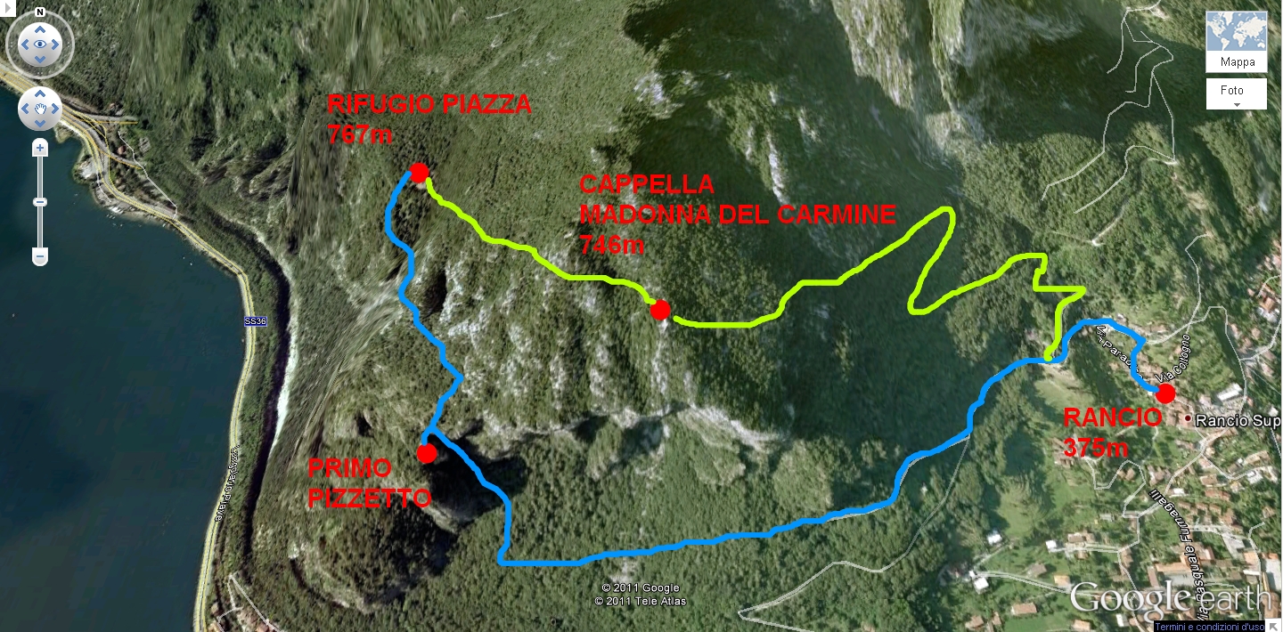 Percorso: loc. Rancio (375) - Rifugio Piazza (767) - Cappelletta Madonna del Carmine (746) - loc. Rancio (375)